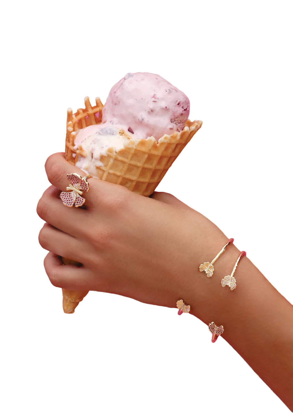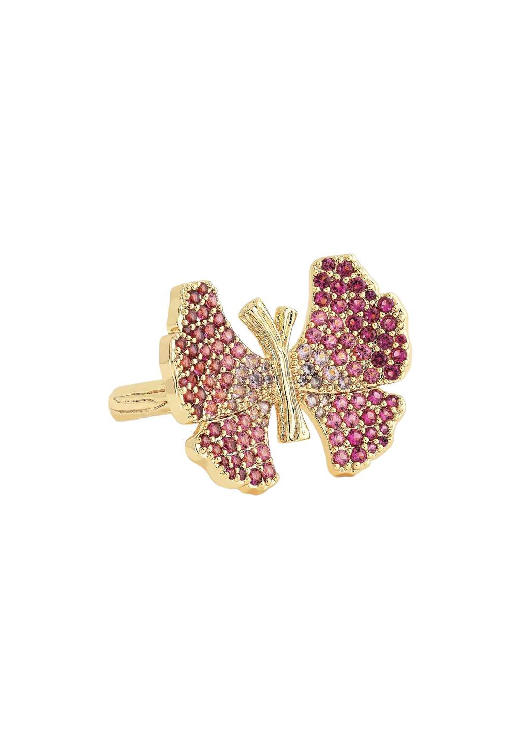 Epitomizing the enchanting convergence of flora and fauna, this butterfly ring is meticulously handcrafted from 18k gold-dipped brass, adorned with a lavish array of hand-set crystals. A luxurious embodiment of sophistication, it effortlessly marries timeless elegance with a delightful sense of whimsy.