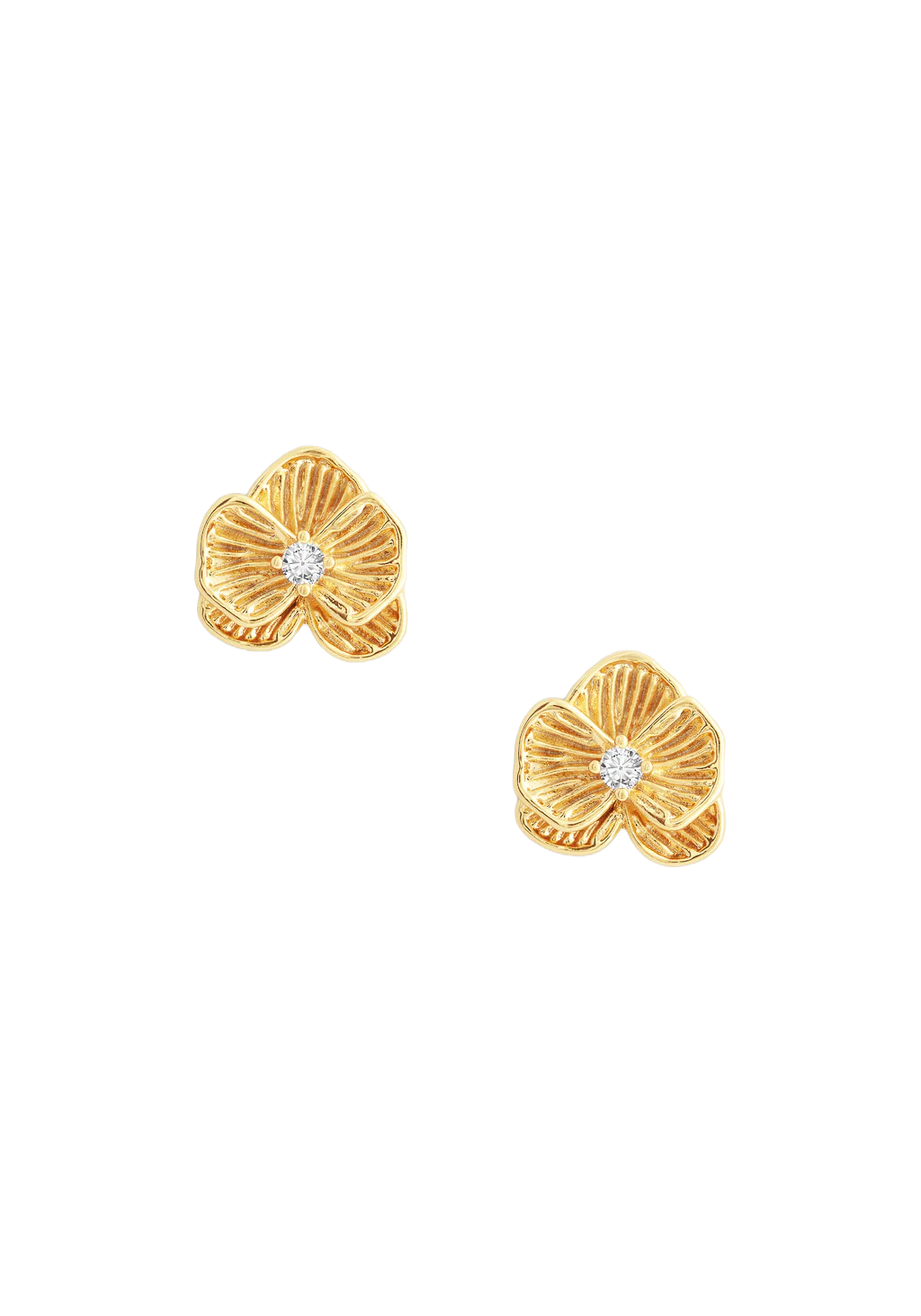 These hand sculpted orchid studs are crafted in 18k gold dipped brass and accented with hand-set crystals. These beautiful and exquisitely made earrings are timeless addition to your everyday wardrobe. Add a touch of elegance and sparkle to your outfit with these hand-crafted orchid studs. Made with 18k gold dipped brass and adorned with hand-set crystals, these earrings are a luxurious must-have for your everyday look.