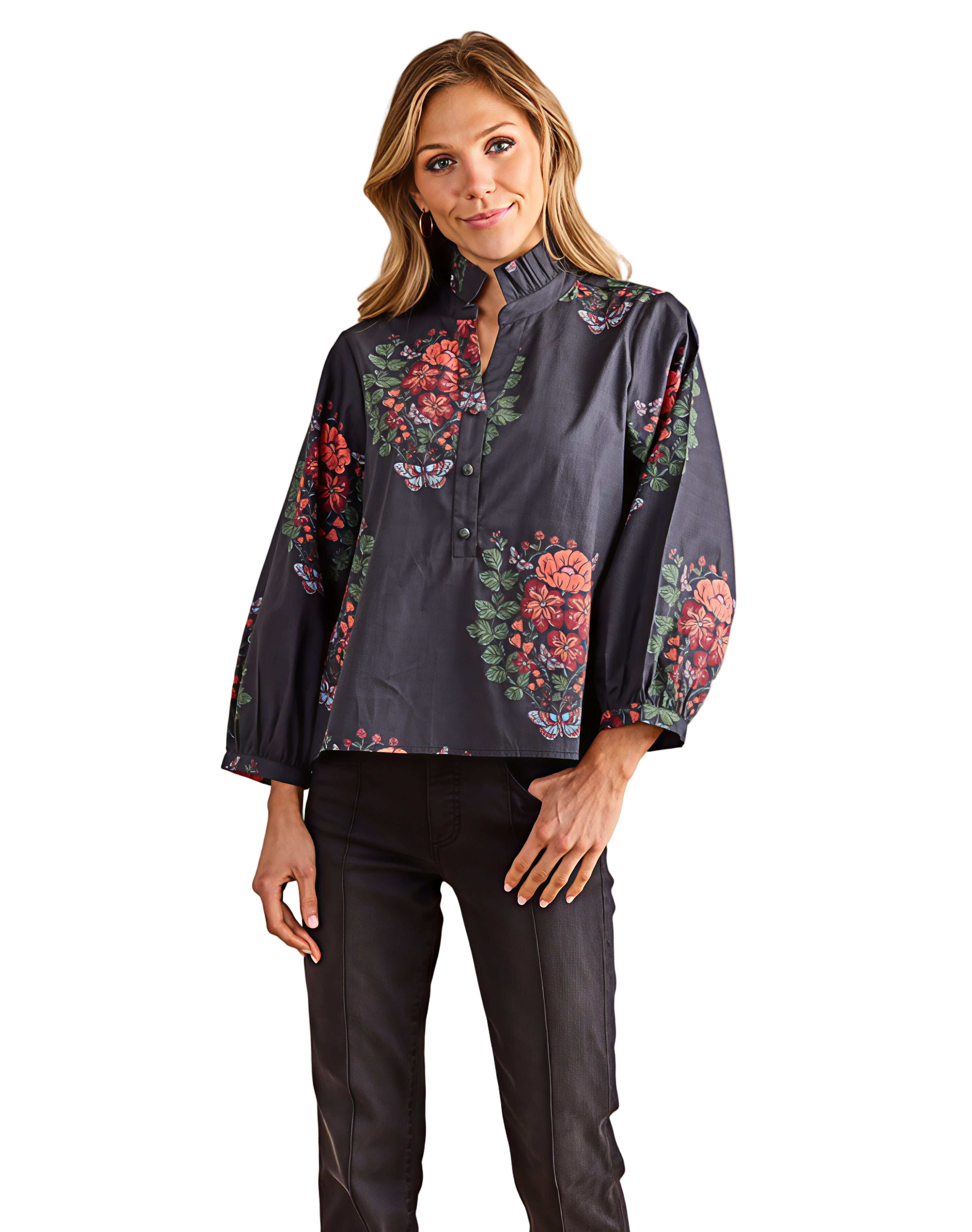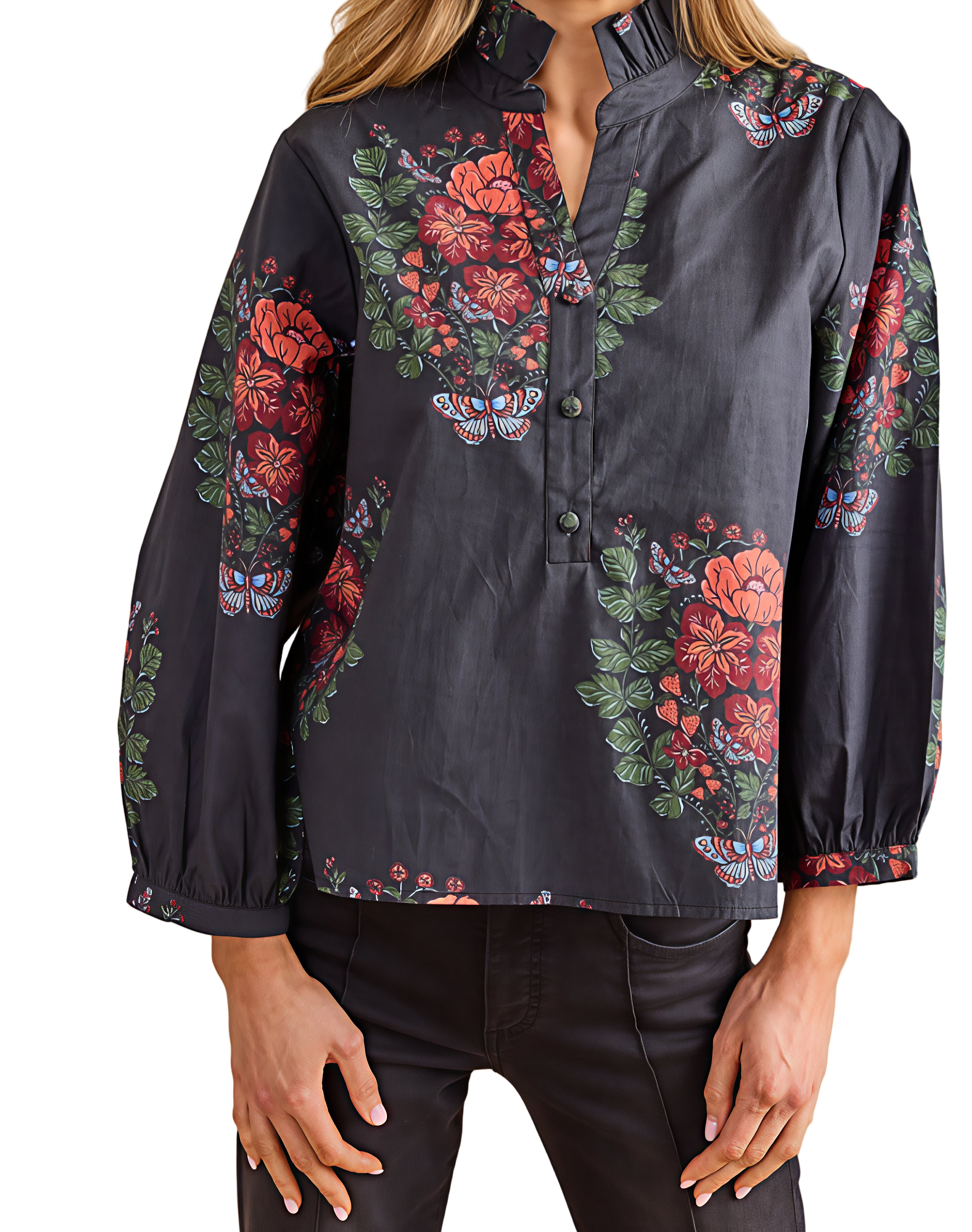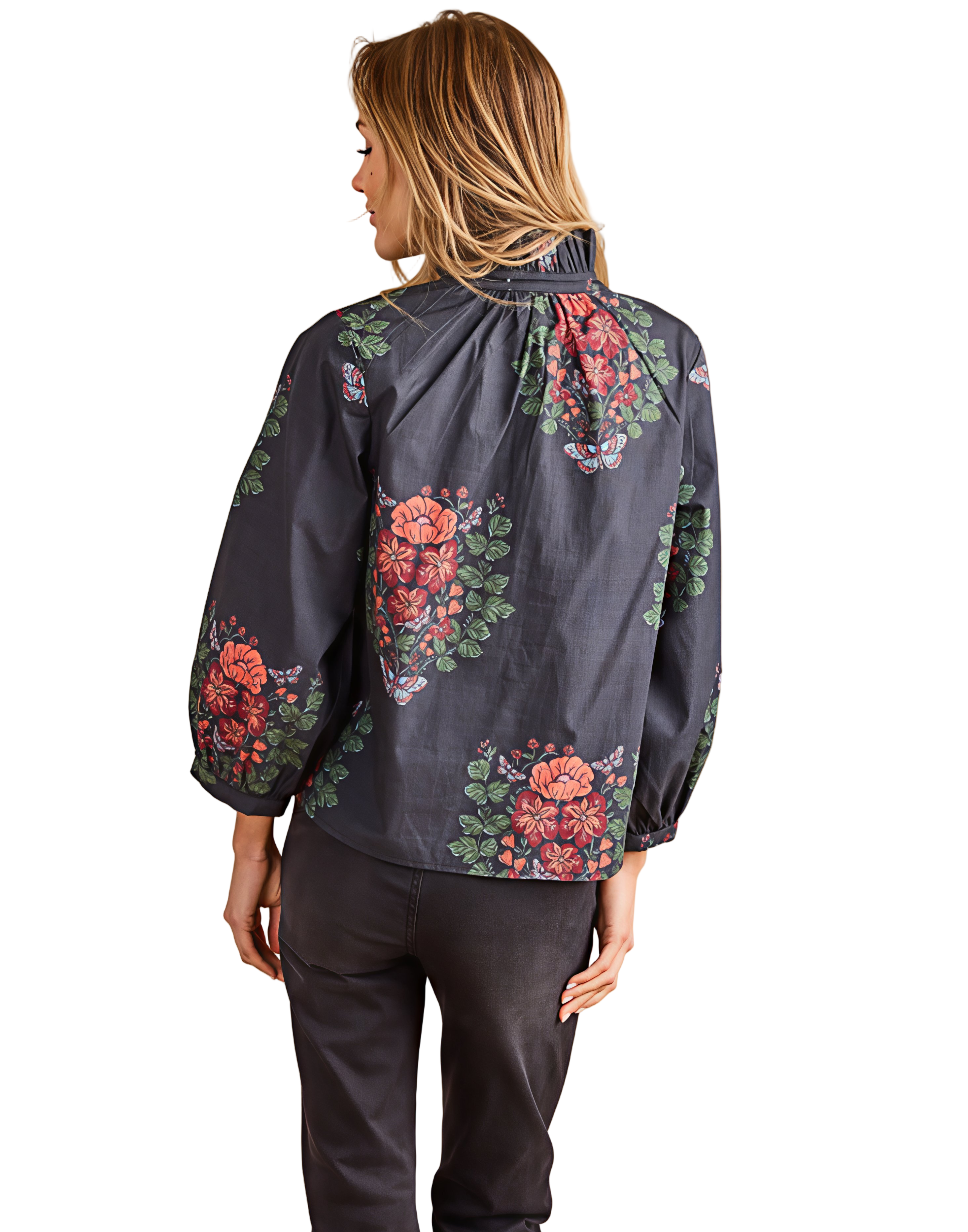 The Daniella Top features a relaxed silhouette with a split neckline and billowed sleeves for an effortlessly chic look. Its rich, nature-inspired print makes it a versatile piece for both casual days and elevated evenings.