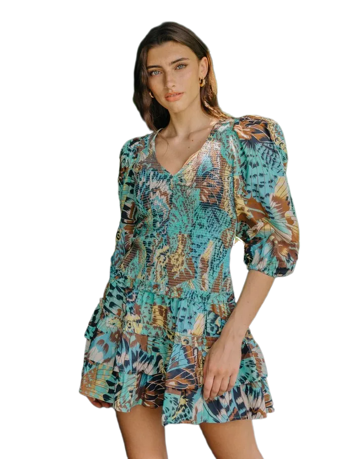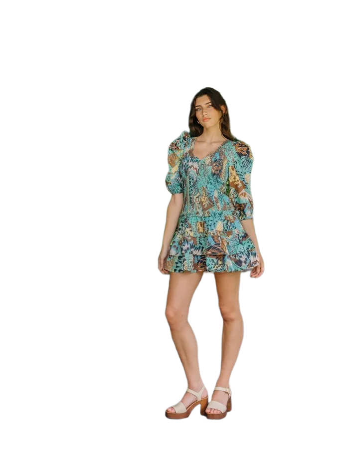 Our Best-Selling Audrey Mini Dress features a smocked bodice, tiered ruffle hem, and puff sleeves — finished with a delicate back-tie.