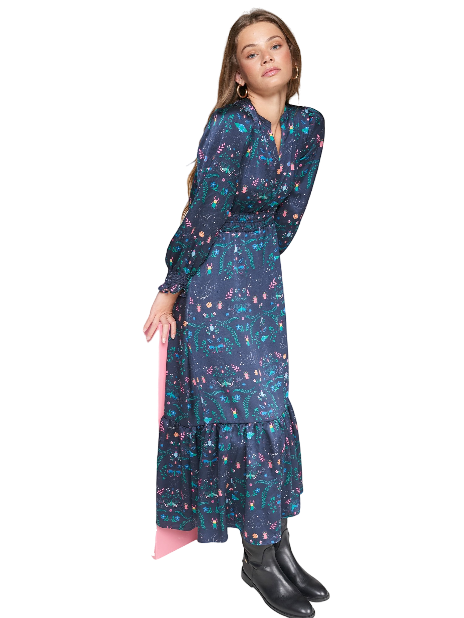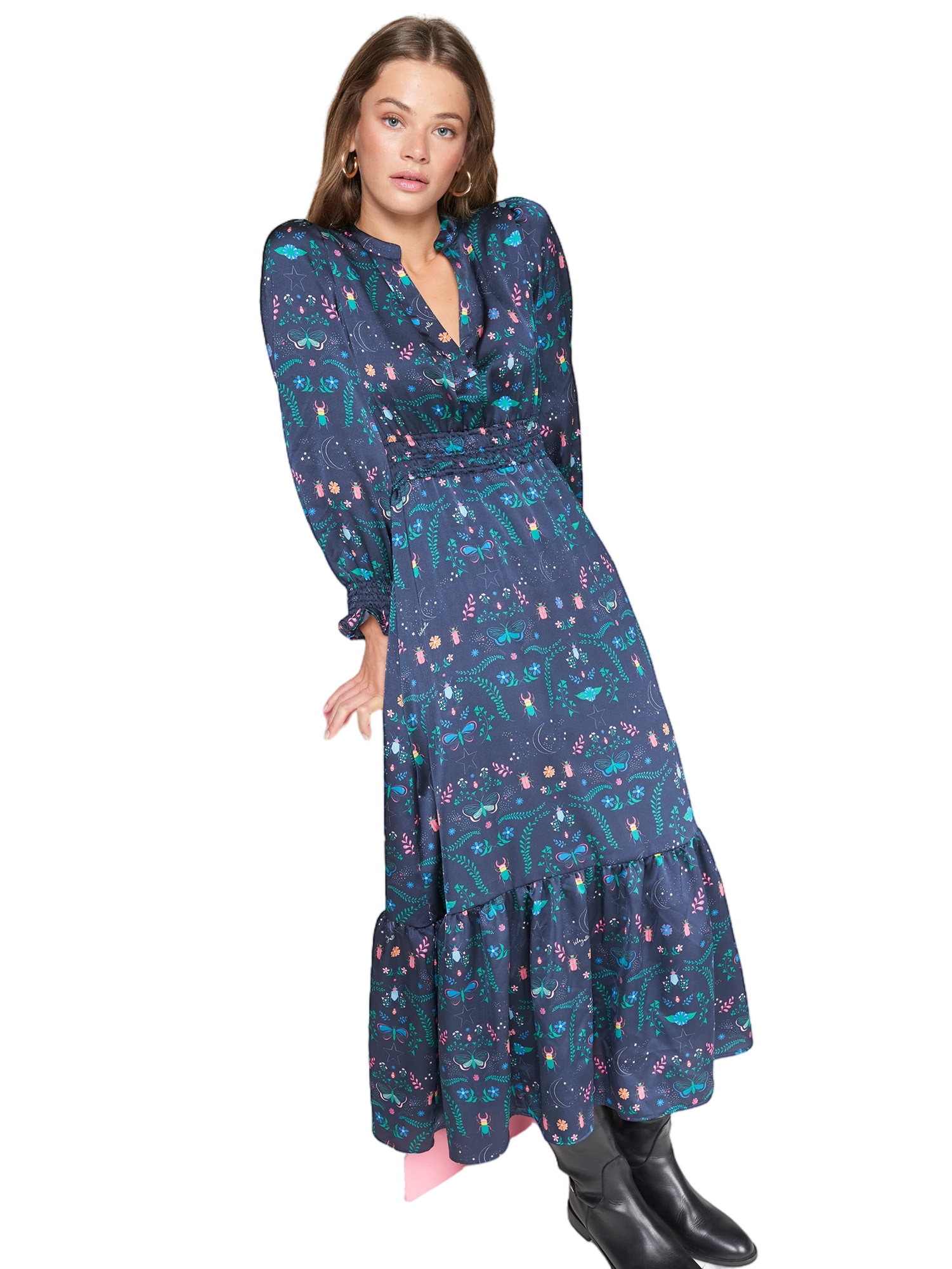 A statement in color and charm, this long navy dress showcases a vibrant mix of insects, flowers, and organic shapes. The straight fit flows into a gathered hem for extra movement, while the smocked elastic waist keeps it effortlessly comfortable. Finished with a V-neckline, long puffed sleeves, and elastic cuffs, it’s crafted from soft, fluid fabric—perfect for bringing a touch of whimsy to cooler days.