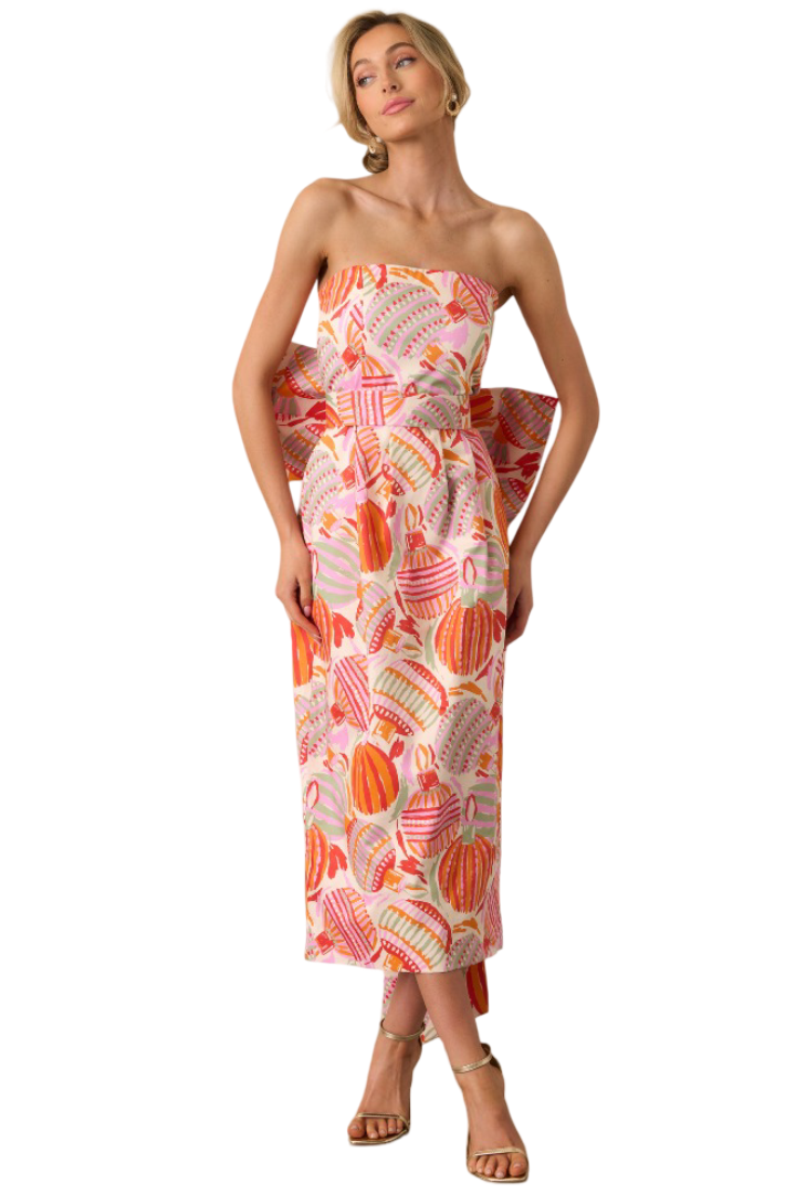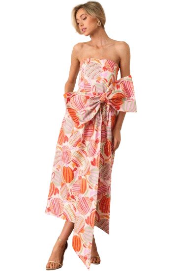 The Lisette Midi Dress is designed to make an entrance. With its strapless neckline and dramatic oversized bow, it strikes the perfect balance between timeless femininity and modern sophistication. The fluid satin fabric drapes beautifully, creating movement that feels as effortless as it looks striking.