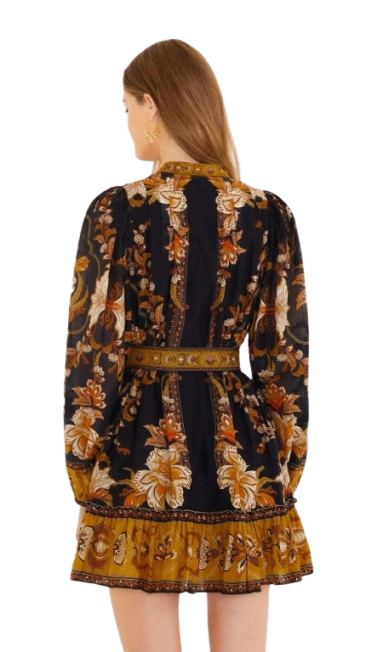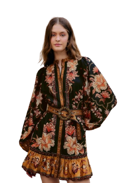 Step into a world of playful elegance with the Black Majestic Garden Beaded Buckle Long Sleeve Mini Dress by FARM Rio. This enchanting piece features a high neckline that frames the delicate beaded floral patterns cascading across rich black fabric. The long sleeves gently gather at the wrists, while the fitted silhouette flares slightly at the hem, creating a graceful movement. Accentuated by a statement beaded buckle, it’s a dress full of vibrant charm and soft sophistication.