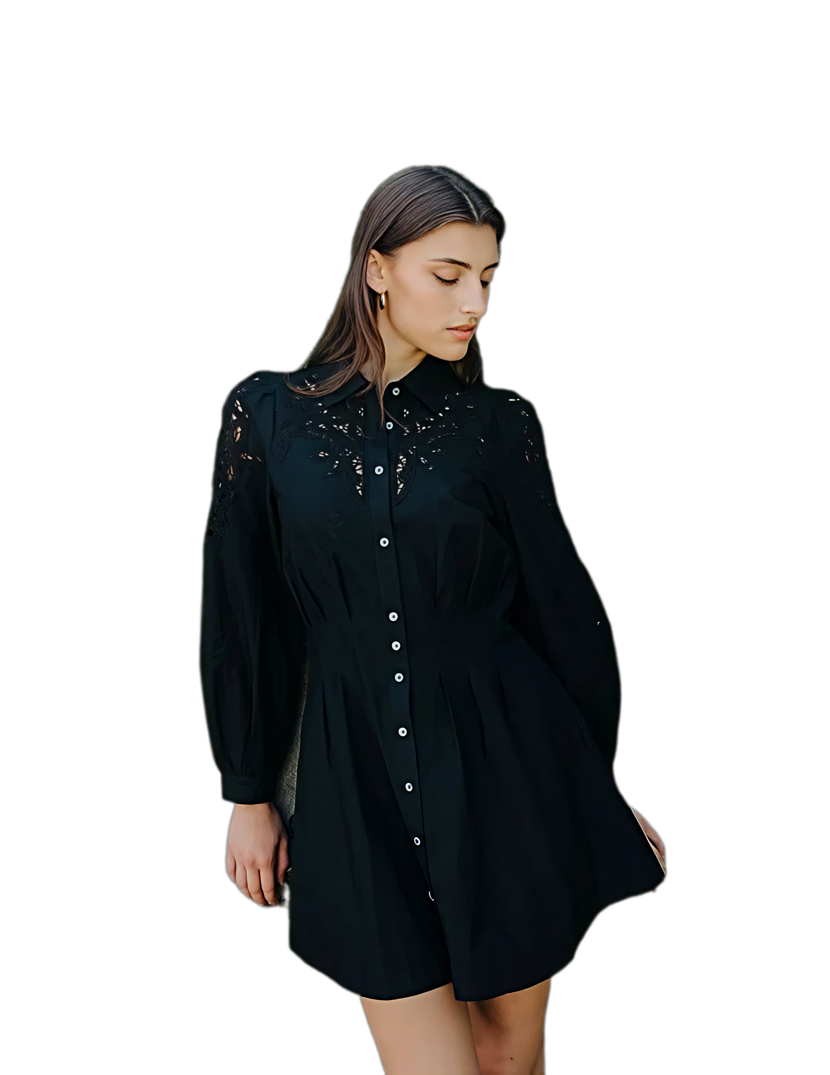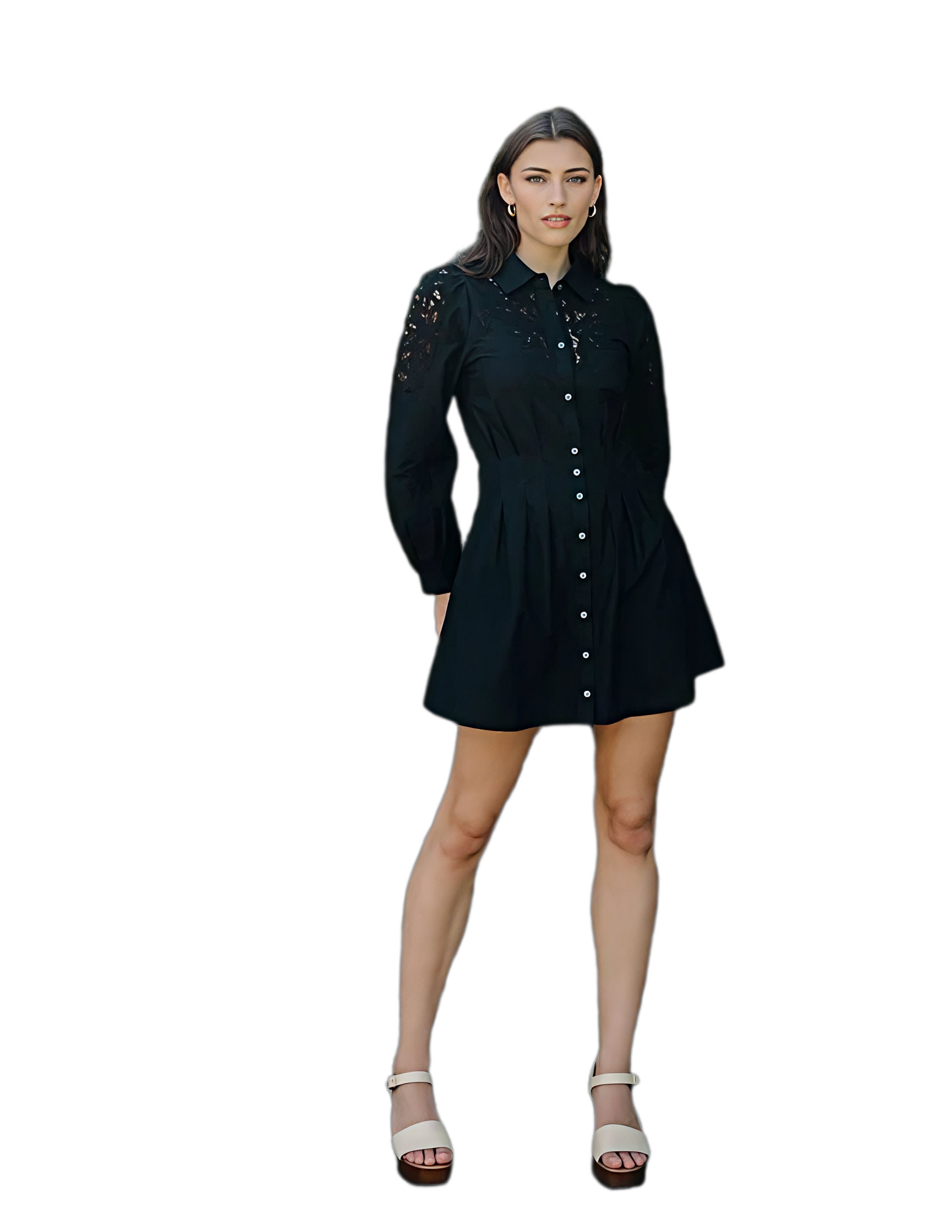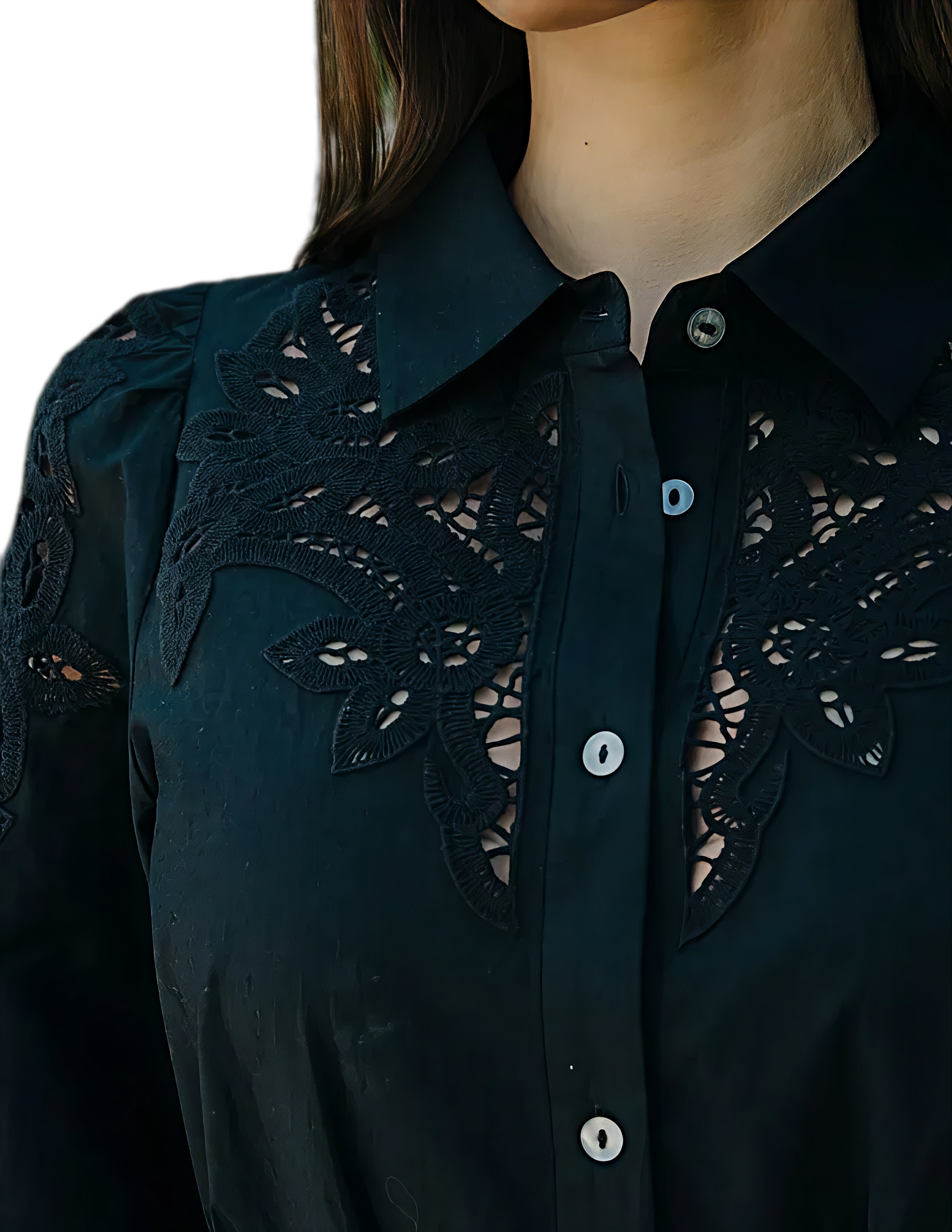 The Long Sleeve Marta Dress in Black features intricate embroidered lace at the shoulders and chest with a tailored silhouette that’s both polished and feminine.