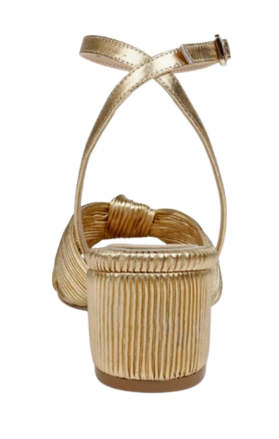 Wrapped in a sumptuous metallic fabric that's neatly pleated, these peep-toed shoes give off a captivating shimmer, turning heads and catching the light as you move. To top it off, the bold knotted vamp acts as a statement piece, and the adjustable ankle strap doesn't just promise a snug fit—it also ties the look together beautifully.