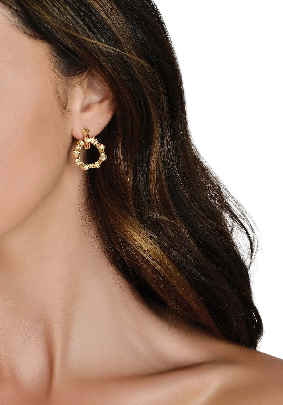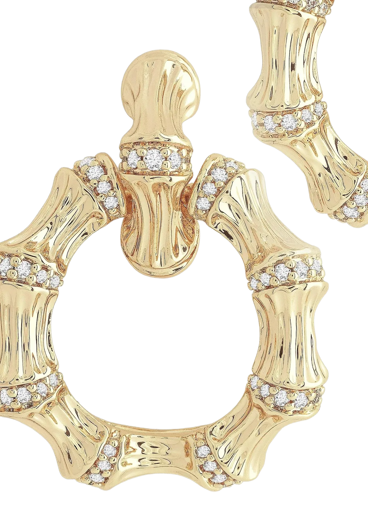 Sculpted from 18k gold dipped brass and adorned with sparkling crystals, the bamboo hoops are thick enough to make a statement, crafted to be worn comfortably. Lightweight and dazzling - these hoops have it all! Made with 18k gold dipped brass and glittering crystals, they'll make a bold statement without weighing you down. Comfort and style? It's a win-win situation.