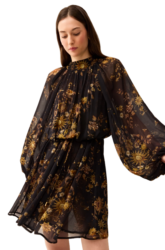 Paired with strappy heels or knee-high boots, our new Bobbi mini dress is ready to party this holiday season. The floaty slip-on silhouette boasts a stand collar, full sheer sleeves, an optional tie belt with bead detailing at the ends. The sophisticated style is the perfect match for the old world glamour of our new Gilded print, a photorealistic celestial floral against an inky black ground.