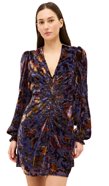 With smocked diamond detailing at the waist and a plunging V-neckline, this cocktail dress is designed to flatter. The true allure, however, lies in the elegant drape of its jewel-toned velvet. Pictured here in a meandering paisley atop luxe burnout velvet with a subtle metallic sheen, the style captures both romance and drama.