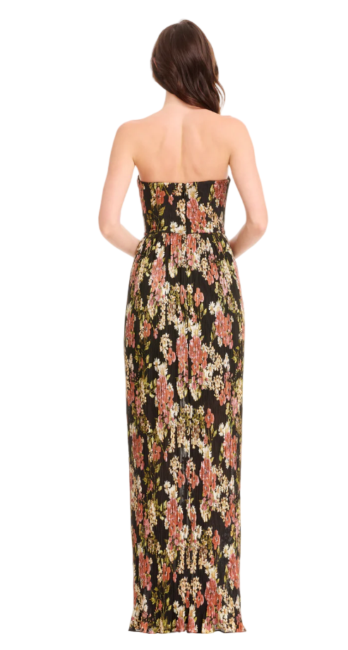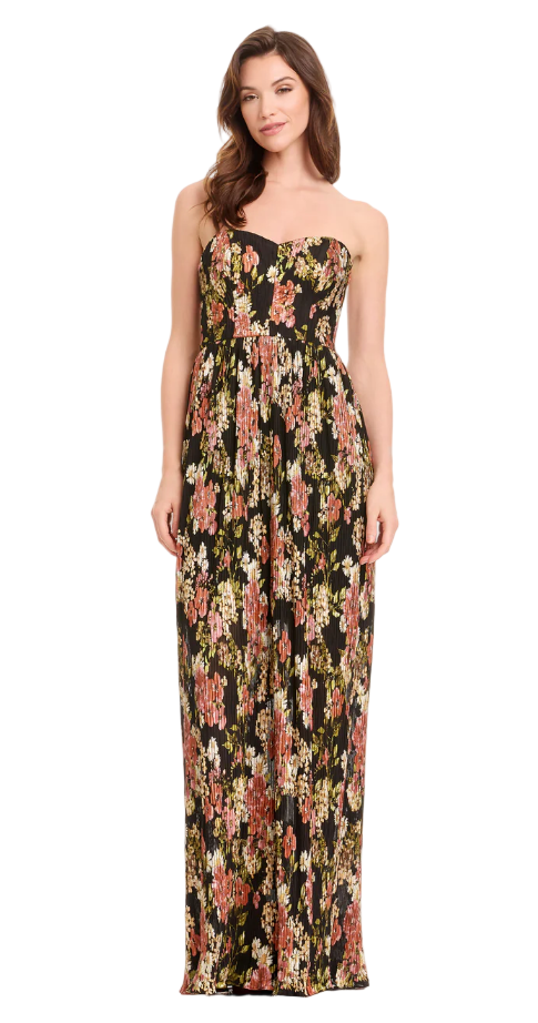 Romantic with a touch of shine—Audrina stuns in a foil floral print on soft mesh, perfectly balanced by a structured sweetheart bodice.