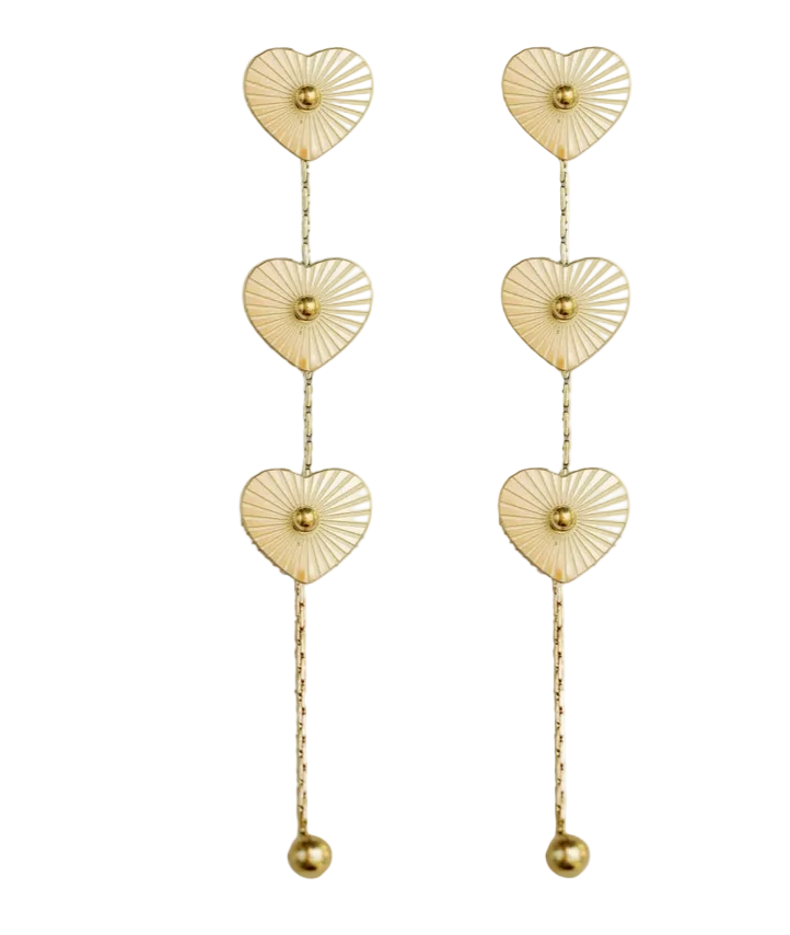 Add a sleek and modern touch to your everyday wardrobe with these easy and on-trend gold plated stainless steel earrings. Featuring three delicate heart charms that swing and sparkle with every movement, these weightless earrings are the perfect easy, seasonless update to pair with both neutrals and prints. Best of all, the 3.5” duster style is basically weightless! This collection is available in a heart, clover and daisy motifs.