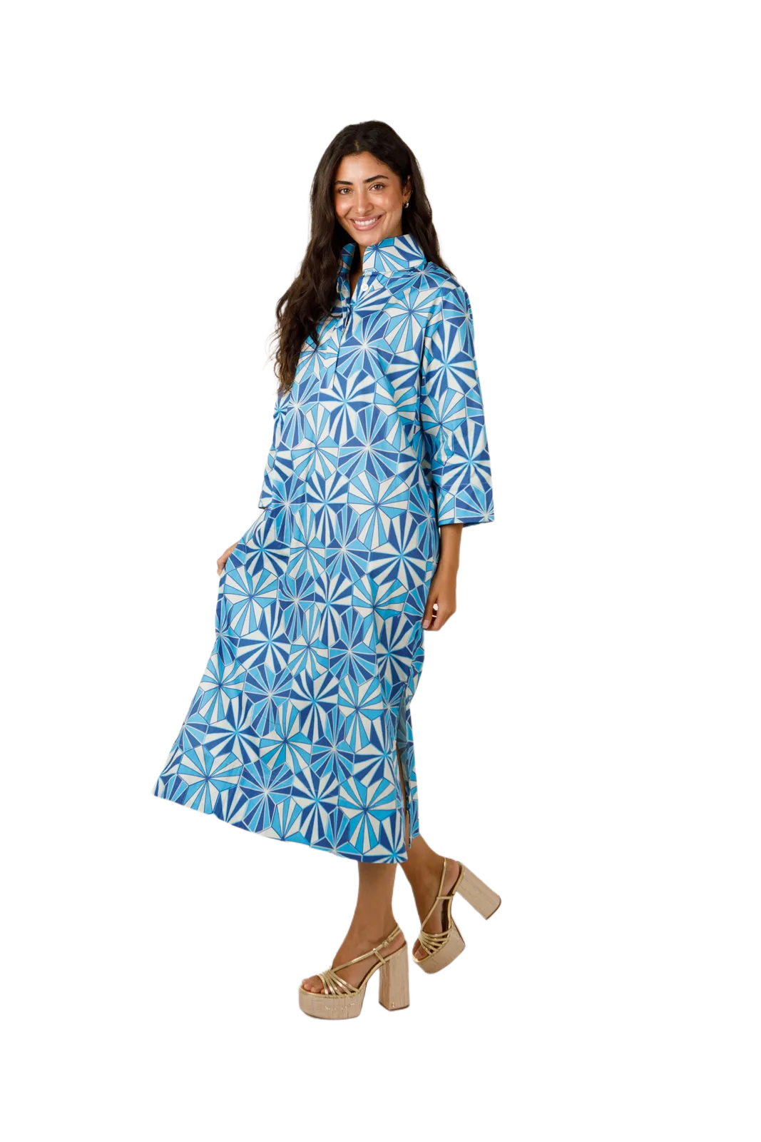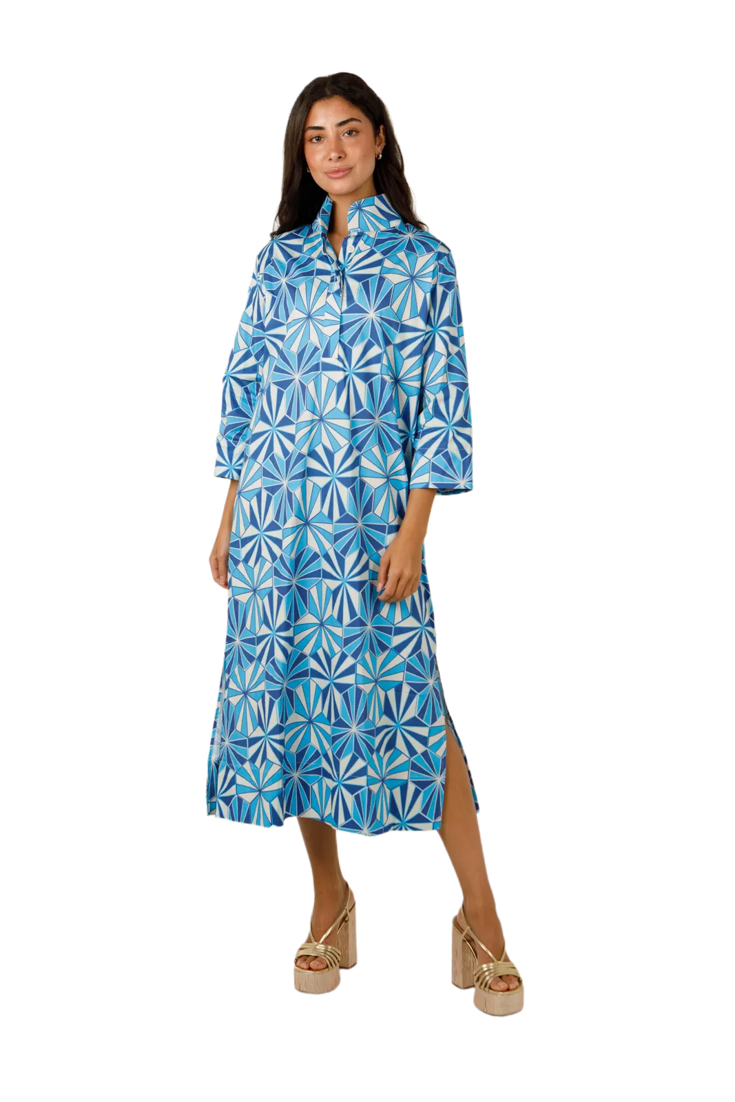 This "nod to mod" stand collar dress is the perfect "throw and go" piece! Extra high stand collar, covered placket, with 3/4 sleeve length sleeves. The Grace is Holly's favorite maxi dress and also our bestseller!