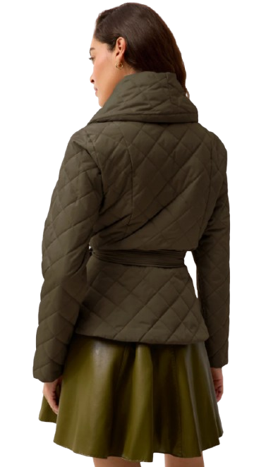 A ladylike quilted jacket never goes out of style, and the Lark effortlessly exudes sophistication while exhibiting form and function. A shawl collar wrap front is paired with a trapunto stitch tie belt and cropped hem for a modern reinvention of a classic wrap coat. Evoking the English countryside, Its deep army green hue adds unexpected versatility for a season spent outdoors, pairing well with the Juniper Green of our Crawford skirt.