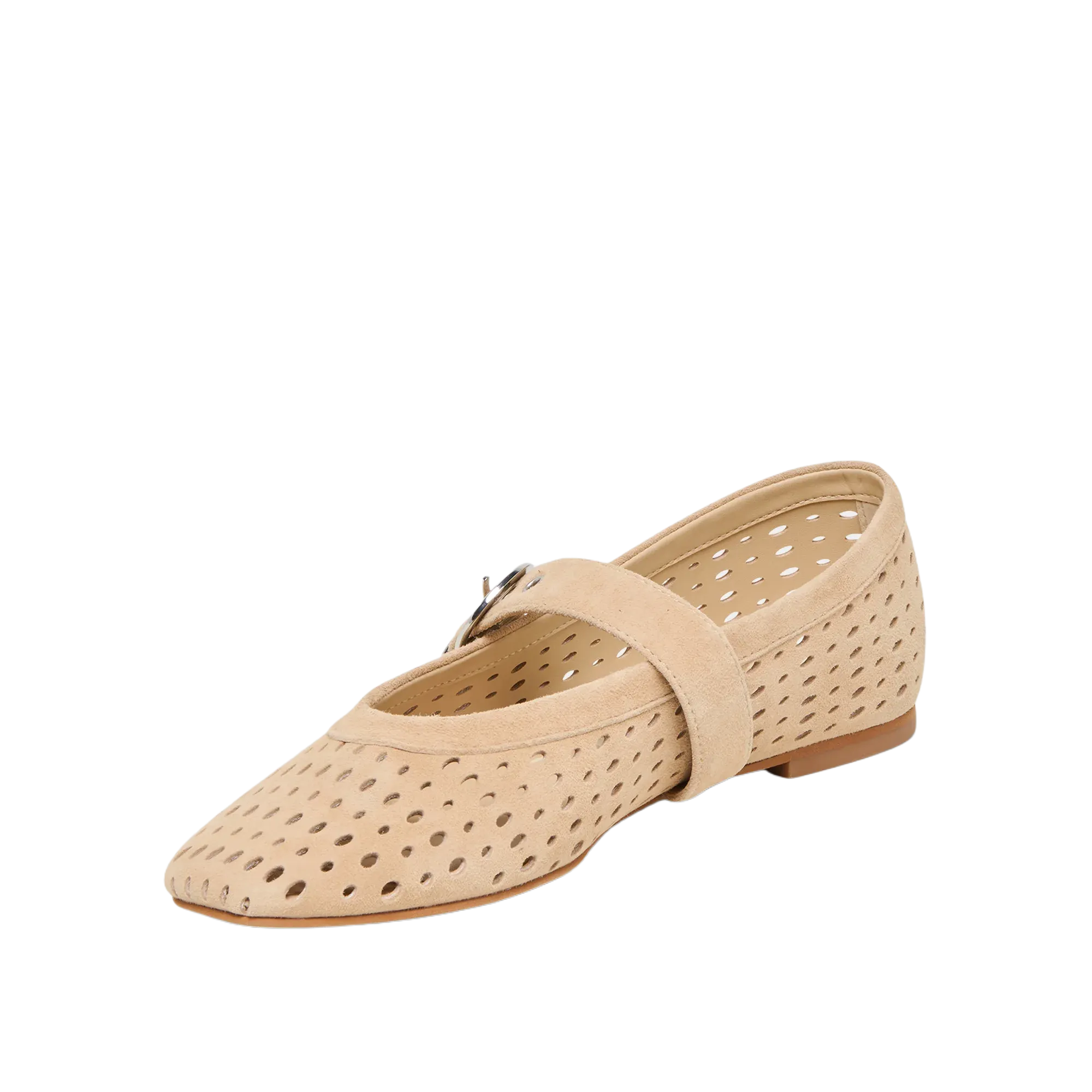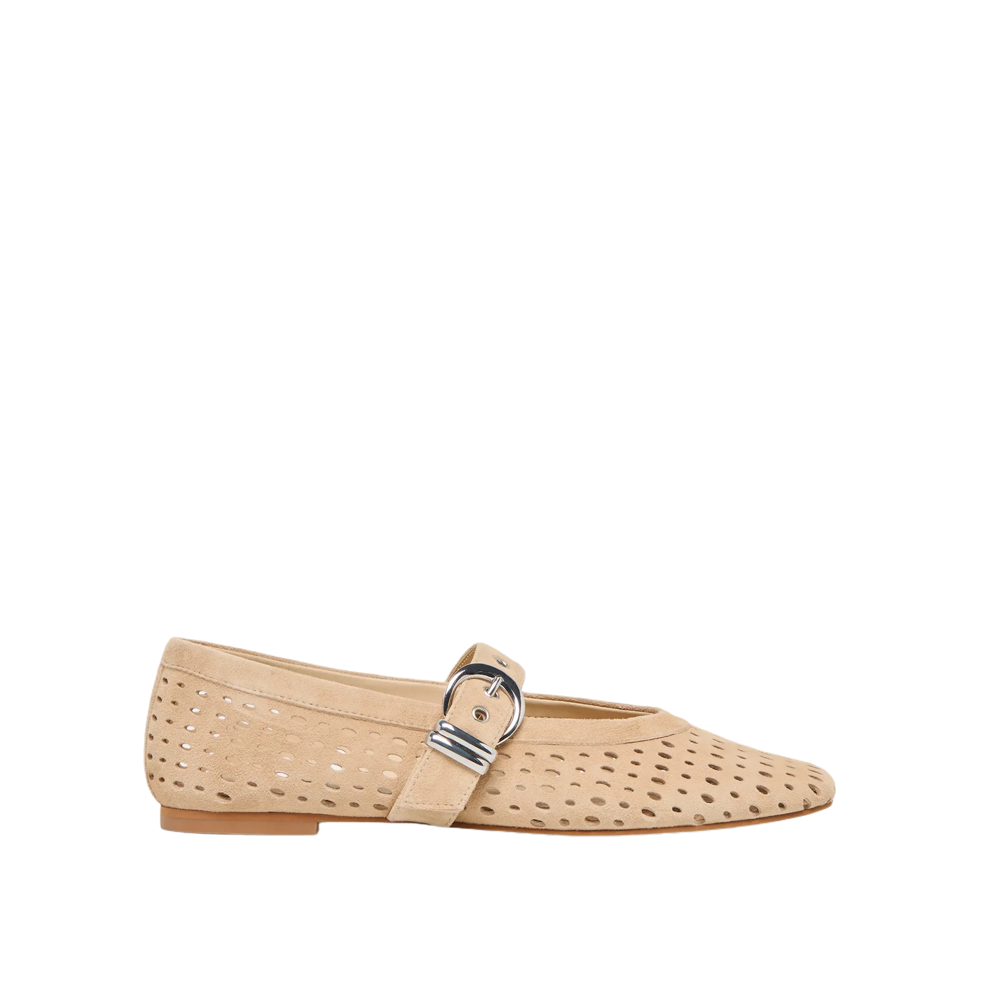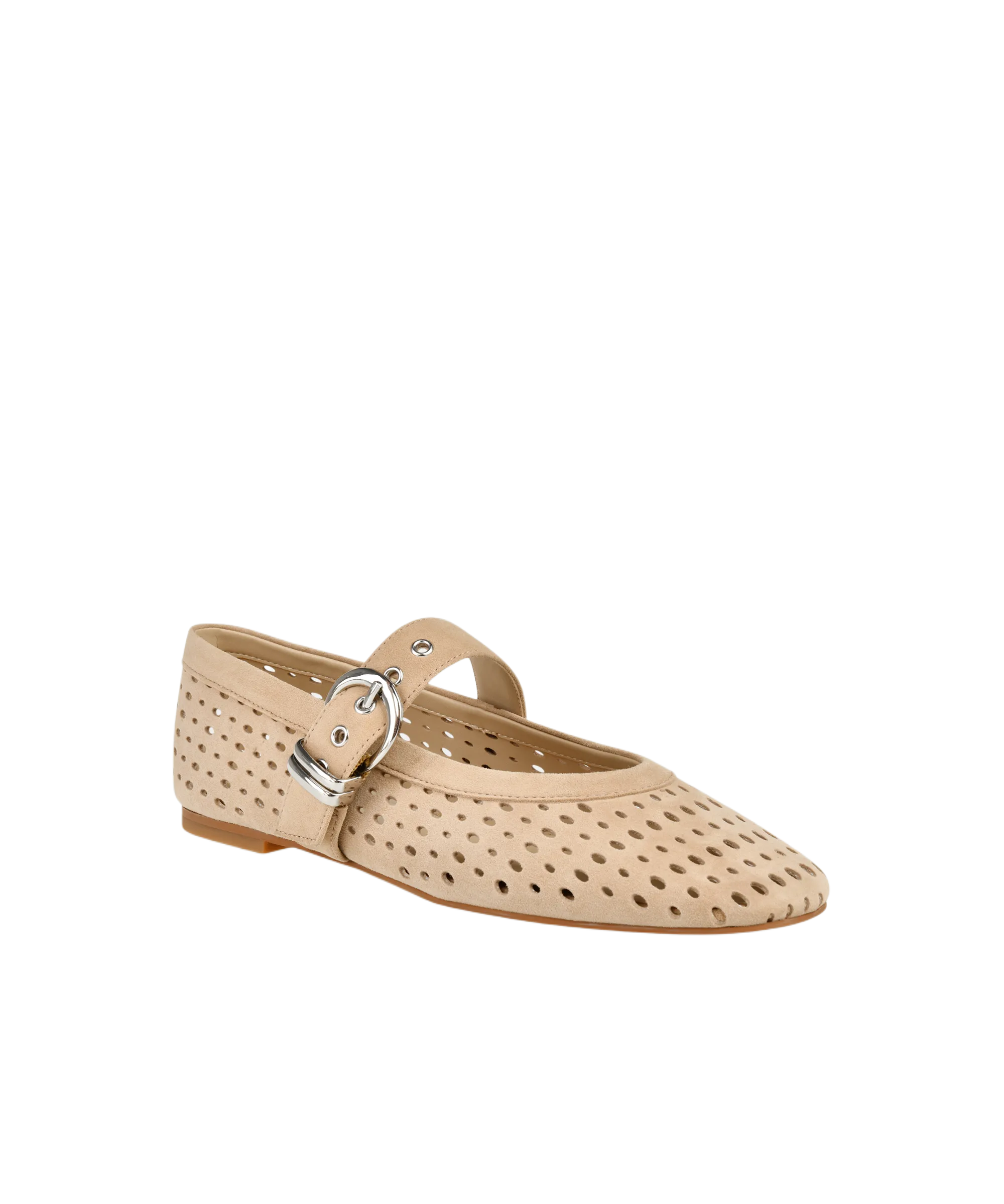 MIKEL makes a statement out of her mary-jane design with a bold metal buckle. This sustainably-crafted flat boasts sustainable materials and a bevy of colorways in perforated suede for one on-trend and versatile ballet flat.