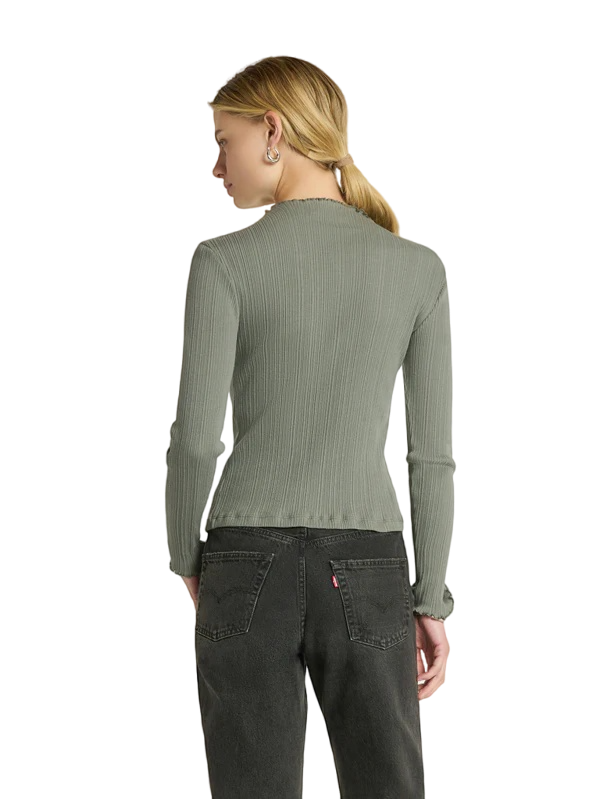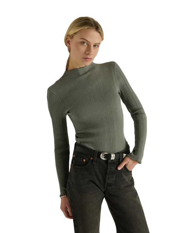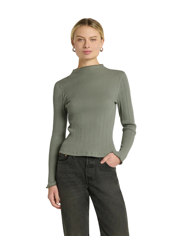 The Brenna is proof that details really make all the difference. This fitted long sleeve has a stunning mock neck, micro-pleated texture, and ruffled finishes at the collar and wrists.  Form-fitting. Snug through the bust, waist, and hips.