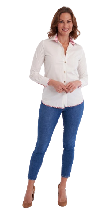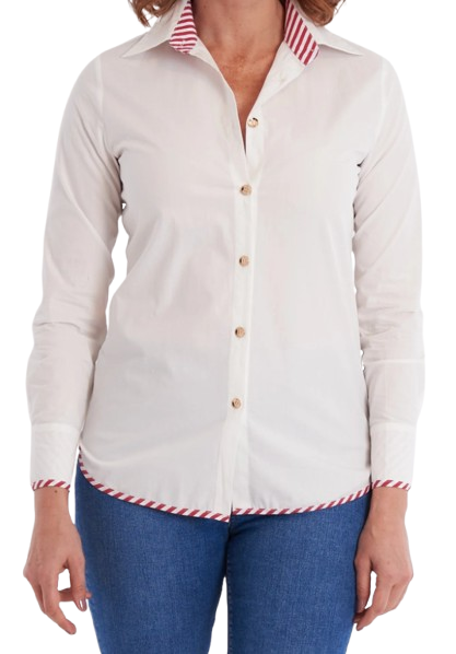 The Bryson Button Down in White/Mulberry Stripe puts a playful spin on a classic look. Featuring clean, crisp white fabric with gold buttons and peek-a-boo striped cuffs, this shirt adds a fun surprise to your everyday style. Perfect for mixing timeless elegance with a touch of whimsy.