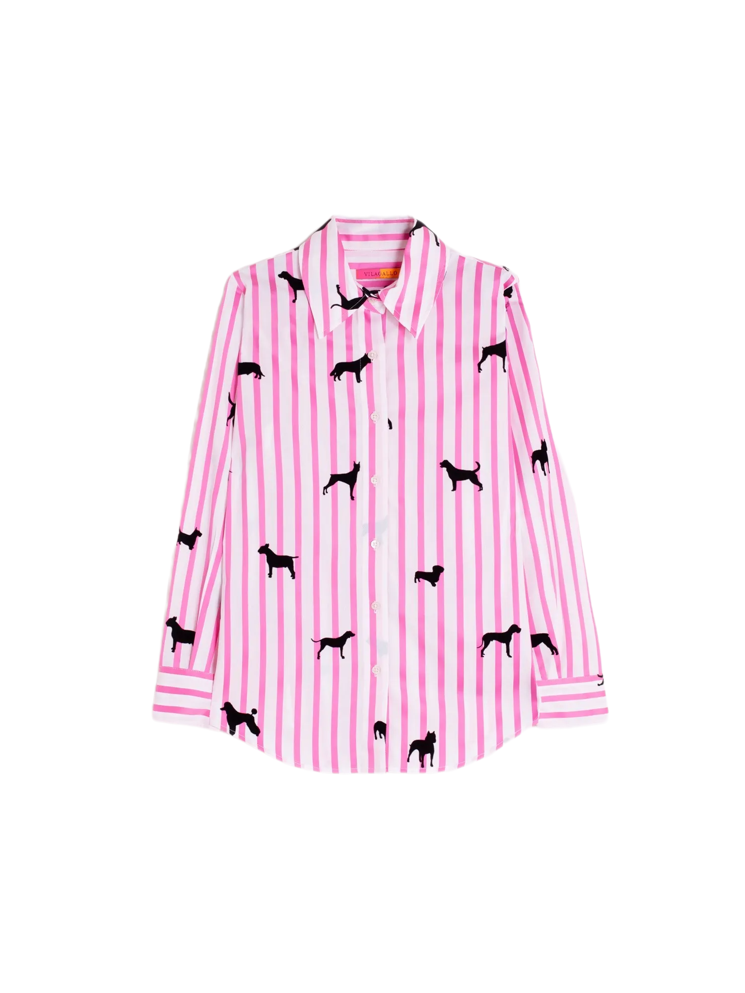 Button-up shirt featuring vertical pink and white stripes with black flocked dog silhouettes across the entire surface. Straight cut with a classic collar and visible front button closure. Buttoned cuffs and slightly rounded hem. Crafted from soft 100% cotton fabric.