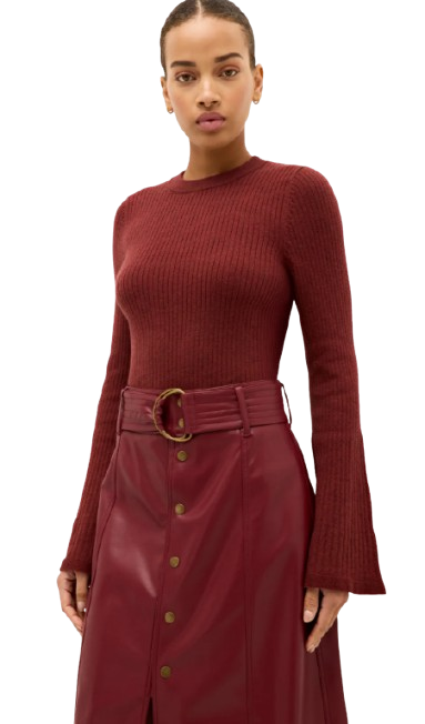 A versatile separate that’s anything but boring, we love the Carrey's body skimming, rib knit fabric paired with bell sleeves. Made even more essential in a seasonal color-soaked rust, it plays well with any number of bottoms from the collection and your closet. Tucked under the Estine wrap skirt in Catalonia, it becomes an artistic statement from the board room to book launch parties.
