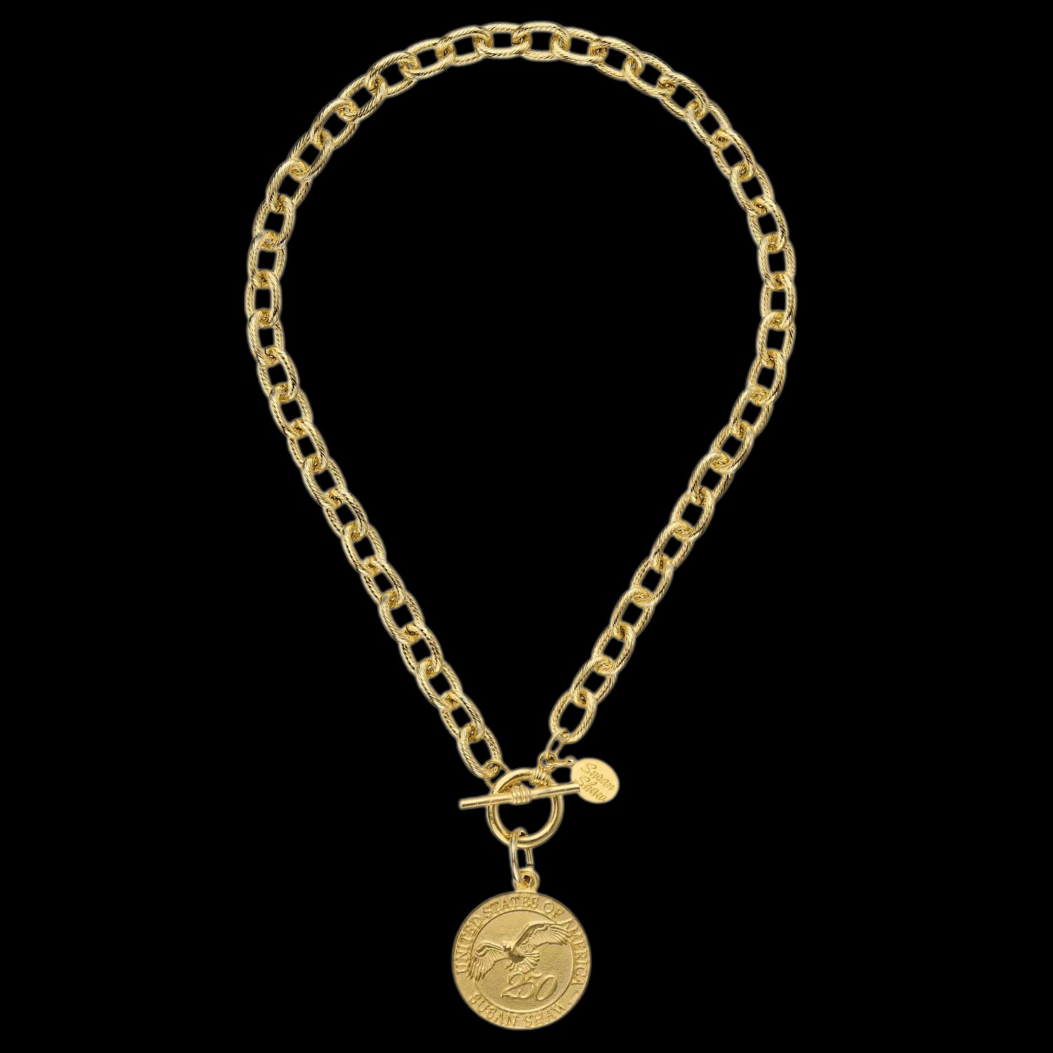 July 4, 2026 marks the 250th anniversary of American Independence! Celebrate this historic milestone with our custom-designed USA 250 Coin, featured here on our iconic and beloved Toggle Necklace. One side of the coin features a waving American flag, and the other features a soaring bald eagle with the number 250. Wear this piece as a commemorative symbol of your patriotism for years to come!